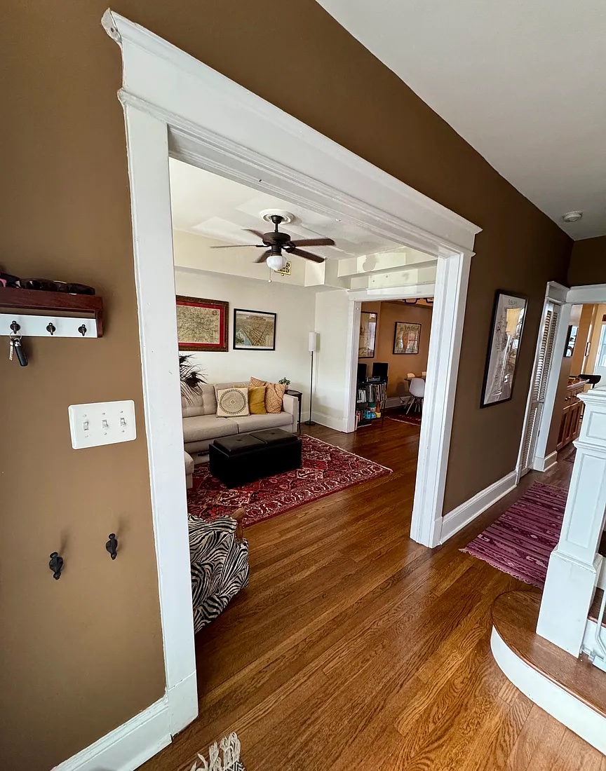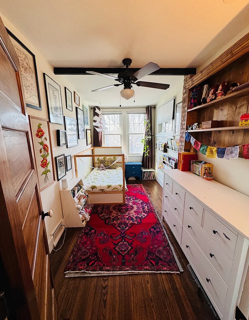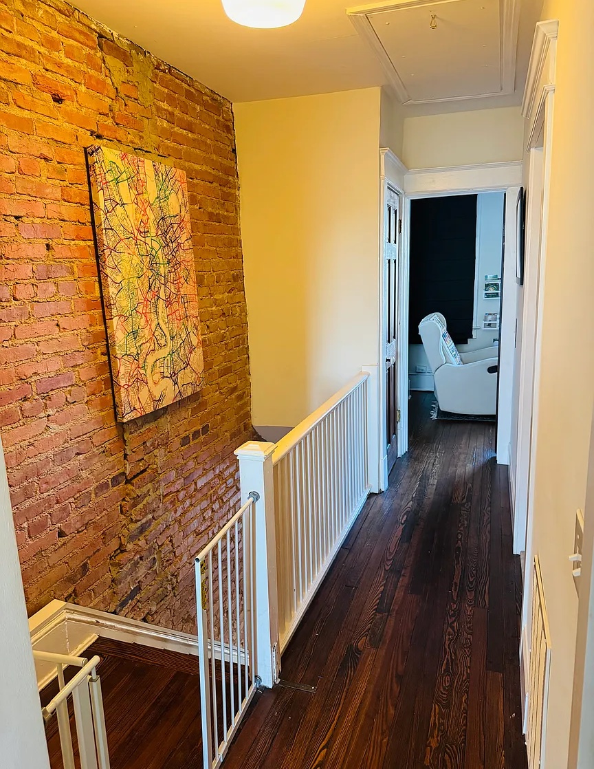 The upstairs was renovated with two full baths and three goodsized bedrooms. The master bedroom currently fits a king size bed and has a full closet. The front bedroom (currently a nursery) has a murphy bed with a queen size bed that folds up into a desk and can be used as an office. A full closet and bathroom were both added to the front bedroom.